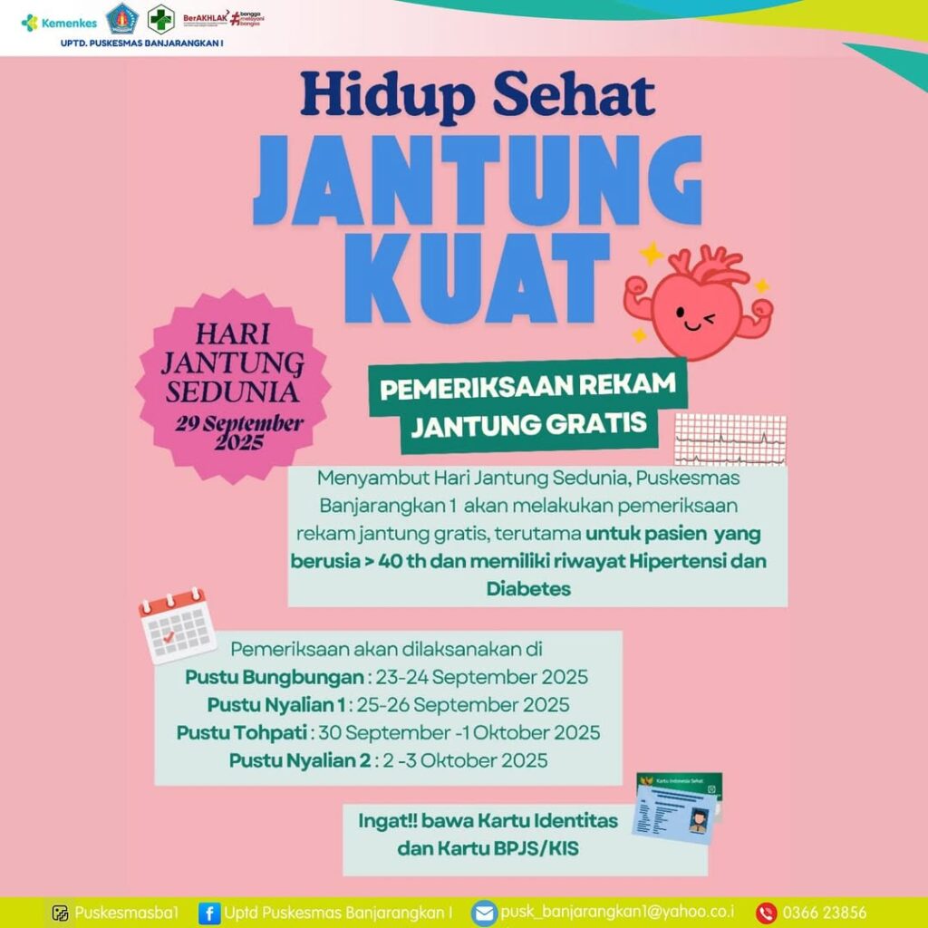 π Puskesmas Banjarangkan 1 mengadakan pemeriksaan rekam jantung (EKG) gratis khusus untuk masyarakat usia > 40 tahun dengan riwayat hipertensi/diabetes.