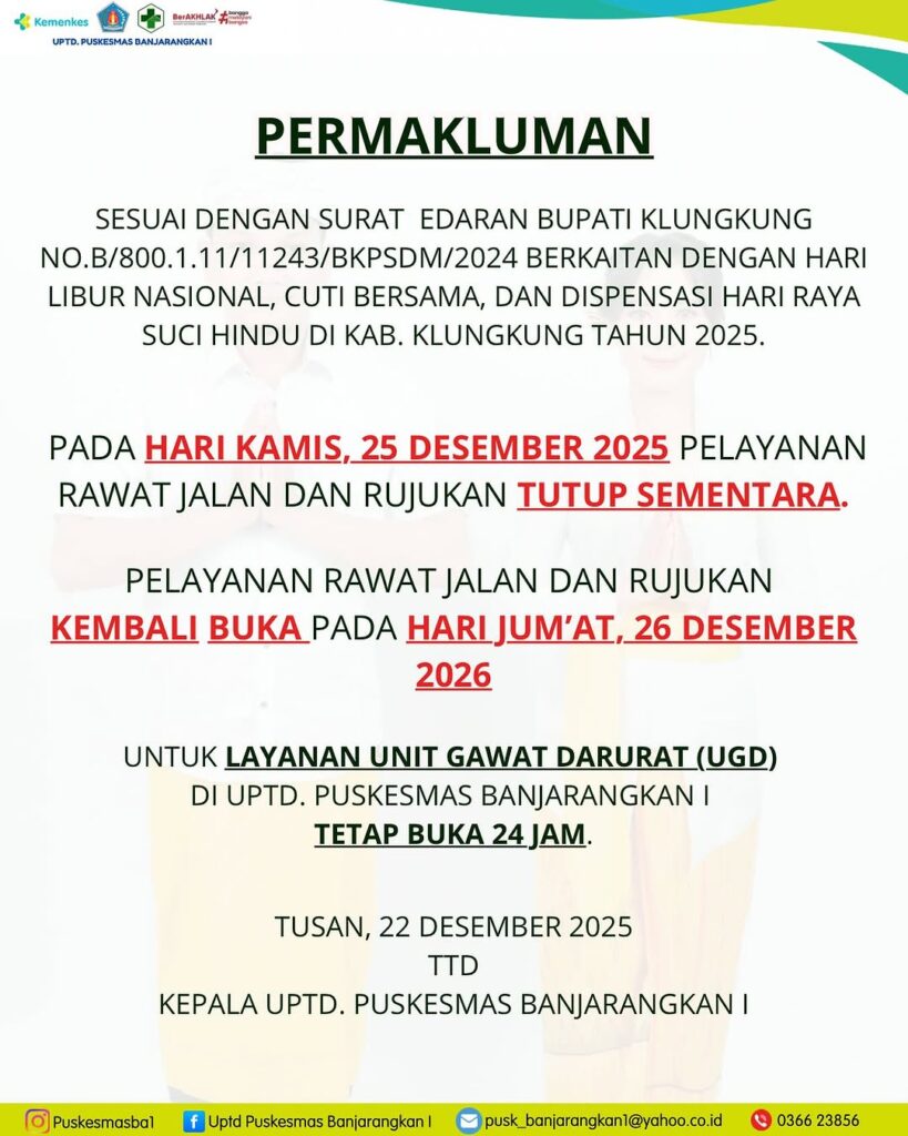 Puskesmas TUTUP/LIBUR : Kamis, 25 Desember 2025